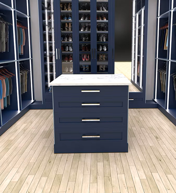 Urban Boreal finish with dual-sided island, crown and base molding, glass inserts, 20” drawers, puck lighting, hampers, and more—our most luxurious option.